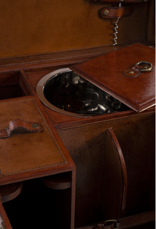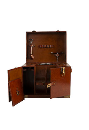 The Buffalo Run Bar Box combines style and functionality for cocktail enthusiasts. Crafted from solid wood and wrapped in luxurious leather with golden brass accents, this bar box is as elegant as it is practical. Lift the hinged lid to reveal multiple compartments for storing standard-size bottles of champagne, spirits, mixers, and tools, along with an included ice bucket. Sturdy leather handles on the sides make it easy to transport, making this bar box perfect for creating your favorite drinks on the go or as a chic storage solution at home.