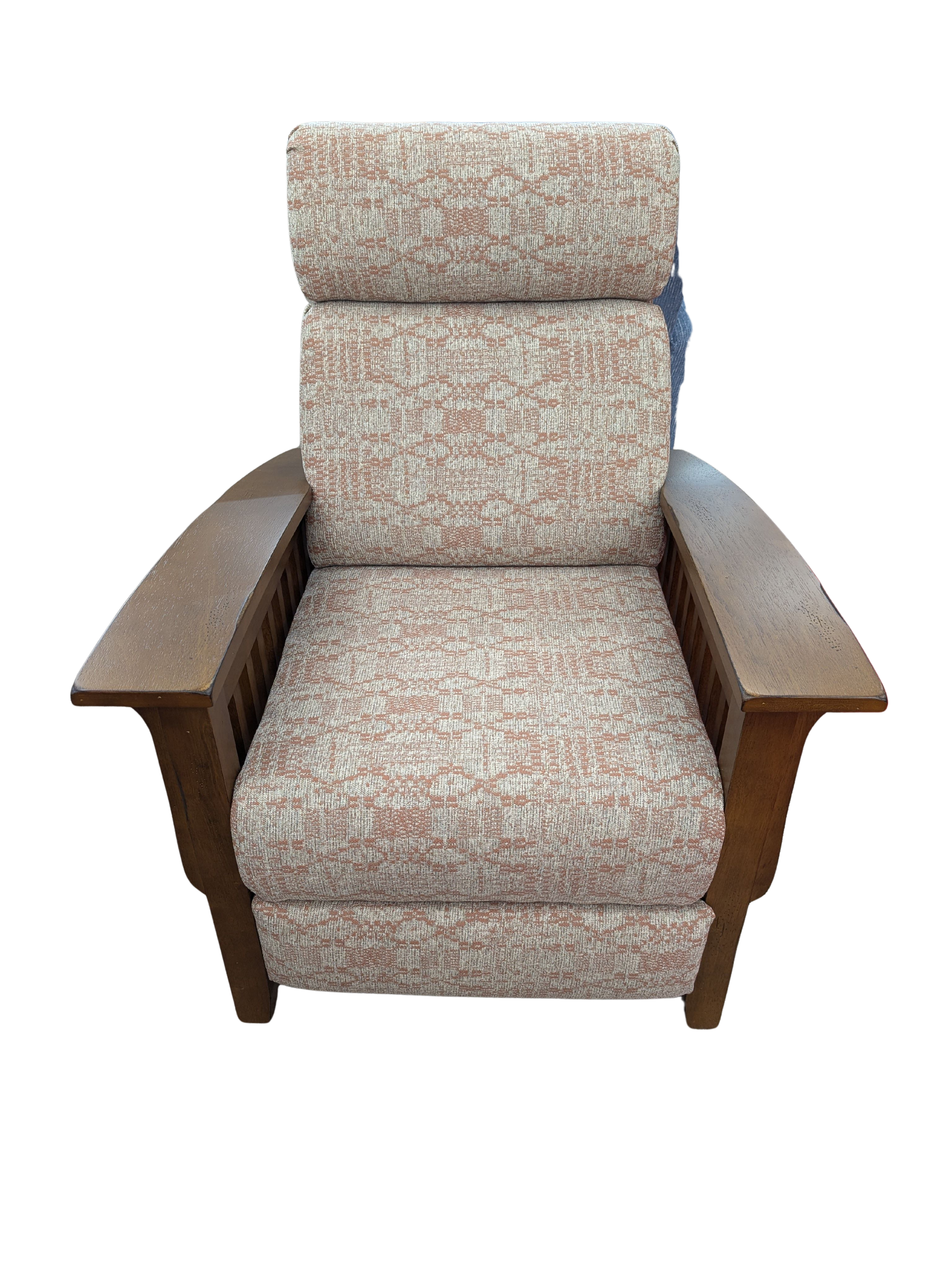 The Tuscan recliner is rustic and relaxing. This mission style recliner offers the solid, handcrafted look of the mission design philosophy. The Distressed Pecan finish gives the wood paneling a warm feel that will accent the fabric of your choice for the supportive cushions. Not only does this offer the style appeal of mission style furniture, but has the outstanding comfort that a recliner offers. Choose from over 700 fabrics and 40+ top-grain leathers to make it your own. Upgrade to Power for a smooth effortless recline that a simple press of a hidden side lever allows you to rest in any position.